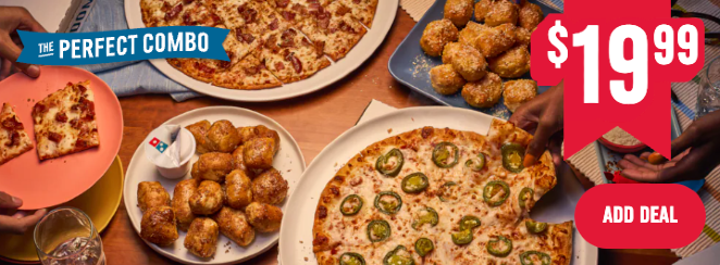 Prices higher for some locations. Two Medium 1-Topping Pizzas and Two 16-Piece Bread Bite Orders, Choose from Parmesan, Garlic, and Cinnamon. Get two medium 1-topping pizzas and two orders of 16-piece bread bites. Choose from savory flavors like Parmesan or Garlic or indulge with sweet Cinnamon.