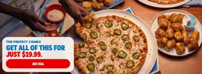 Get two medium 1-topping pizzas and two orders of 16-piece bread bites. Choose from savory flavors like Parmesan or Garlic or indulge with sweet cinnamon.