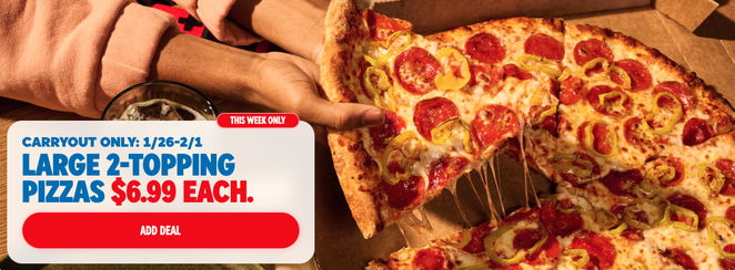 Spend less dough when you carry out a 1-topping pizza on any of our 6 delicious crusts, plus 8-piece wings or boneless chicken.