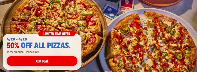 You must ask for this limited time offer. Valid 4/20 - 4/26. Prices, participation, delivery area and charges may vary. Offer applies to the pizza portion of your order placed online only.